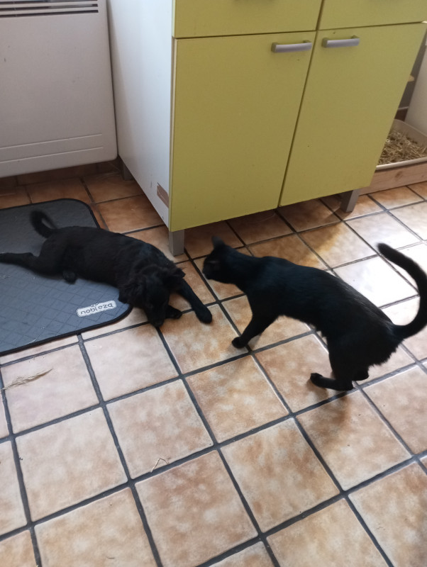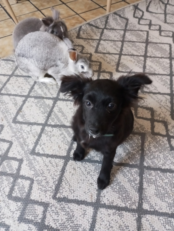 Et comme vous pouvez le voir sur les photos, les autres animaux de la maison l'ont totalement accepté. Il est très sage avec eux. J'avais peur qu'il les course ( les chats couraient les lapins à leur arrivée et pendant un moment après) mais pas du tout.