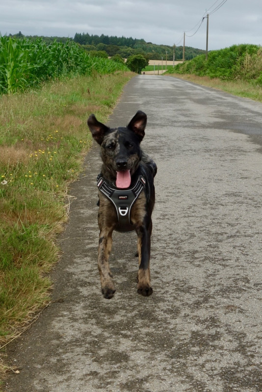 Shyva (F), née en 2021. Croisée beauceron x bouvier. Début canicross/VTT en loisir.