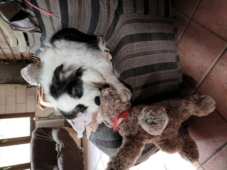 Je vous présente donc Jaroo, alias Boudin. Border collie (connerie ) de son état... 9 ans, une oreille et la queue en moins.... Mais qui me rend très fière de lui au quotidien vu là d'où il vient et les progrès qu'il a fait. Enfin je peux être sereine sur son avenir.....