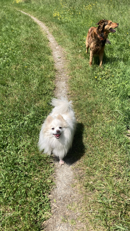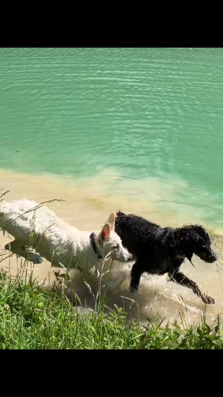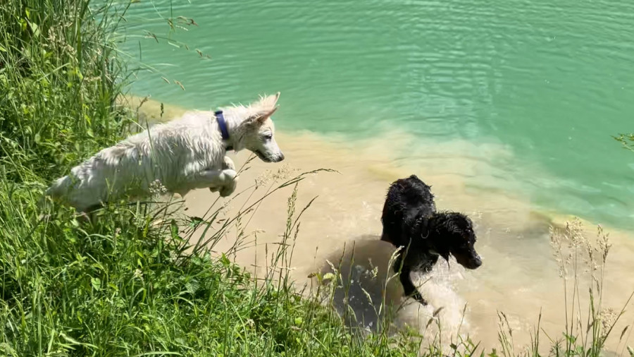 Pareil lorsqu'il se trempe les pattes dans le lac, il ressort un peu siphonné, et me refait des épisodes de "AH, OUH, ça mouille, ça mouille", et il te saute dessus, essaie de chercher la connerie, et je sens que c'est pour se décharger car l'expérience est cool, mais pas super cool en fait,