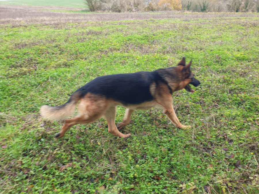 Shyva (F), née en 2021. Croisée beauceron x bouvier. Début canicross/VTT en loisir.
