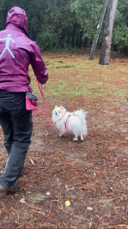 De manière générale, il a été top : il a patienté en voiture sans moufter, j'ai pu lui mettre un harnais de mantrailing classique (donc pas son harnais habituel), il a vraiment pris sur lui au premier passage avec la pluie. La coach et la deuxième victime l'ont caressé (avec mon accord) sans qu'il ne déclenche.