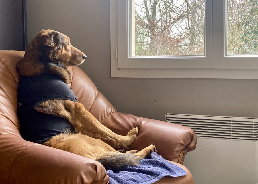Je trouvais qu'il respirait un peu fort ces derniers jours au repos, et qu'il haletait "plus que d'habitude" quand il était excité. Hier soir en allant se coucher ça a empiré. Il respirait vite et fort, le cœur battait fort aussi, on sentait une espèce de double pouls en posant la main sur son thorax. J'ai hésité à appeler le véto de garde mais je préfèrerais qu'il ne meure pas à la clinique. Ça s'est calmé en fin de nuit.