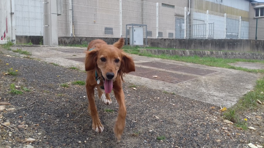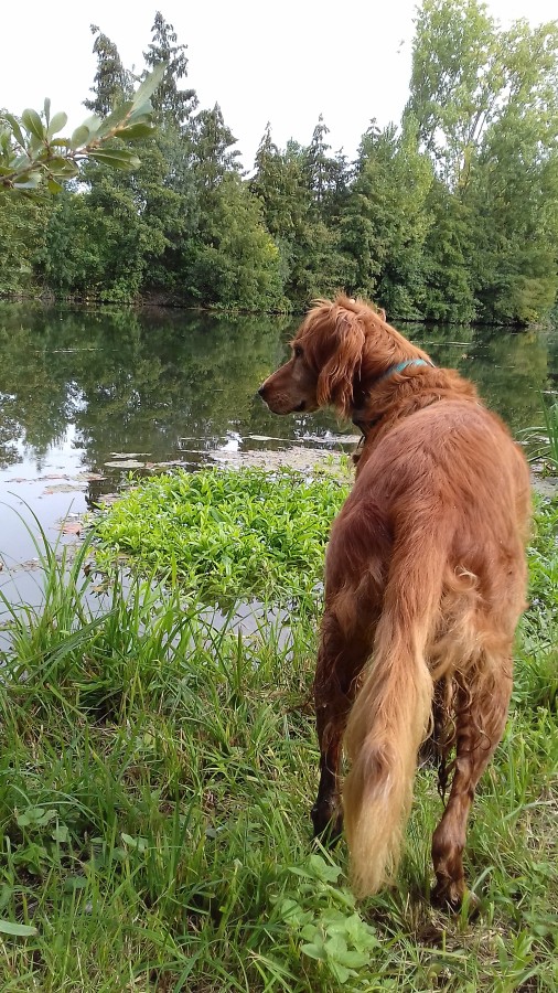 - La noireaude (F), setter irlandais x braque, née en 2013. Canicross en compétition, à la retraite.