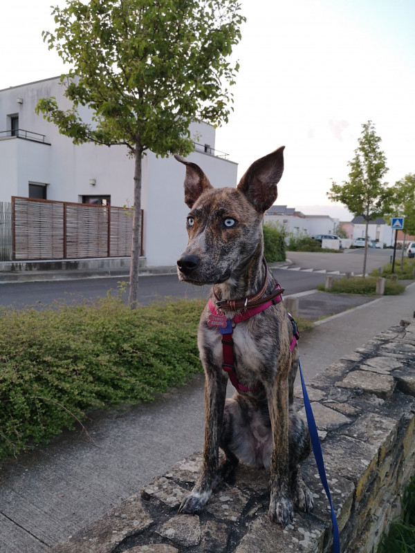 Prunelle (F), croisée berger de Roumanie, née en 2022. Veulent se mettre le canicross et l'agility.