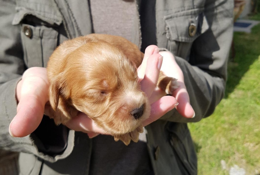 Je vous présente la petite Pearl (on l'écrit Pearl mais prononce Perle, juste un ptit kiff sur l'écriture en anglais ahah). Une typée cocker qui a pour le moment 18 jours (16 sur la photo) et qu'on pourra aller voir chaque semaine jusqu'à ce qu'elle soit assez grande pour nous rejoindre! :D
