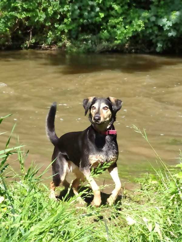 Prunelle (F), croisée berger de Roumanie, née en 2022. Veulent se mettre le canicross et l'agility.
