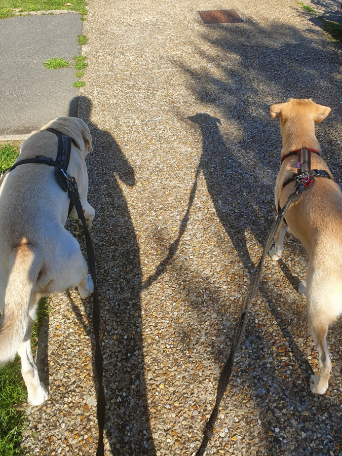 Et ensuite il faut mettre des règles pour la marche à deux : ici ils n'ont pas le droit de passer derrière moi (sinon je finis ficelée comme un roti), ils peuvent se mettre a la place qu'ils veulent (mais j'ai des copines qui imposent tel chien a gauche, et tel chien a droite), quand un chien s'arrête, je m'arrête aussi et du coup l'autre aussi.