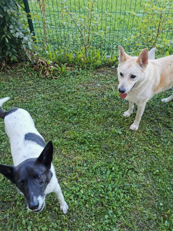 Prunelle (F), croisée berger de Roumanie, née en 2022. Veulent se mettre le canicross et l'agility.