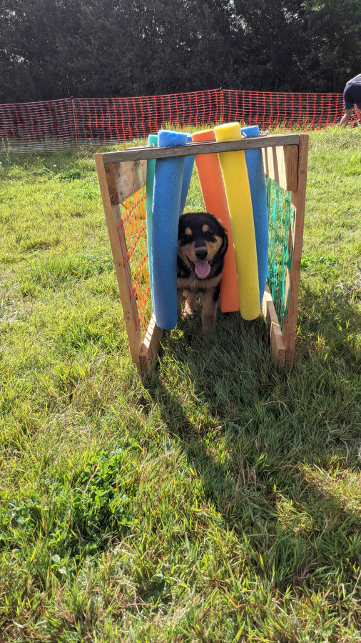 Ce matin 2eme séance avec découverte de l'environnement (piscine à balles, passer sous des rubalises, des chaînes, des frites, marcher sur un coussin d'air, sur différents type de sol etc), aller de cacher et appeler le chiot. C'était très sympa comme séance mais elle était cuite !