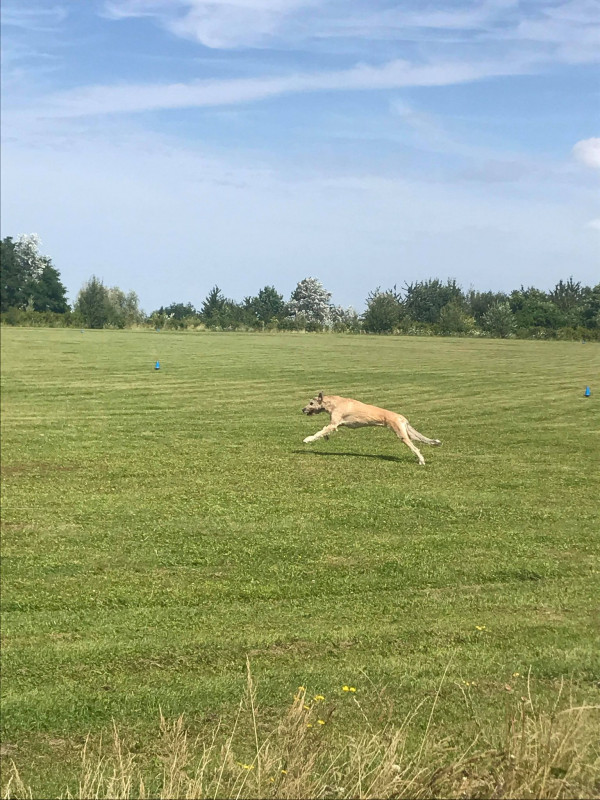 Bon apres je voulais pas emmener popette mais bon je vais pas la priver de tout non plus , on l'a donc embarqué , elle a joué sur le terrain de pvl ( droite comme un i attendant que le leurre demarre ) le leurre n'a jamais démarré alors s'est rabattue sur Lucky et Pilou ( l"irish treeeeeees poilu et le galgo poils durs ) pour jouer et courir un peu , bref une bonne jour