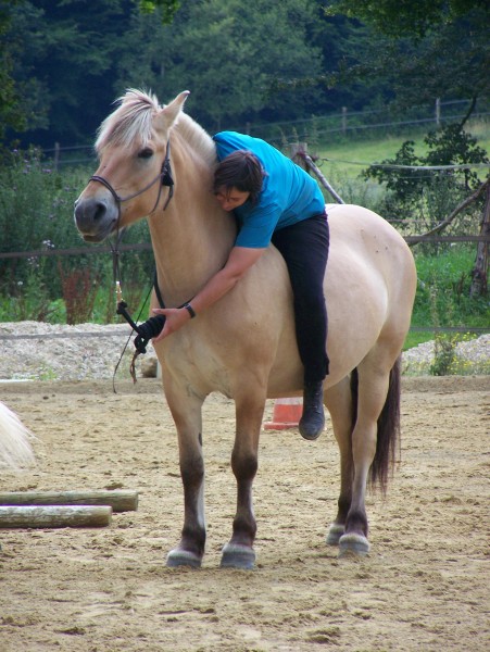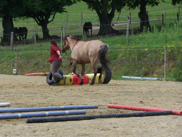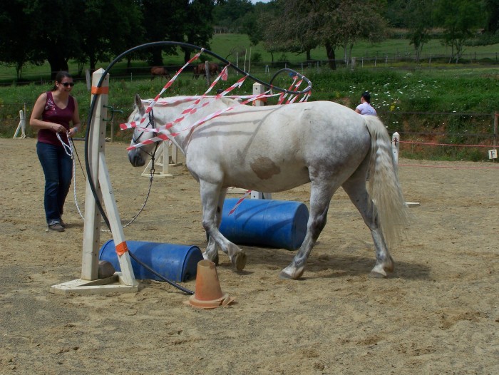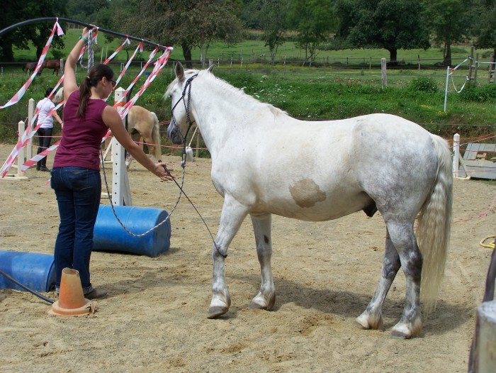 Dans cette exercice, ce qui est difficile est de gérer le cheval qui s'emballe un peu ou beaucoup par rapport au stimulis, il faut tenir le cheval assez proche pour pouvoir garder l'objet en contact du cheval.