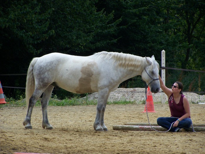 Car si, (comme on a tendance à vouloir faire, car on se dit, ohhhh le loulou il a peur, je vais arreter de l'effrayer!!), il ne faut pas retirer l'objet en contact tant que le cheval bouge, sinon il associera, que bouger enlève la chose qui fait peur, alors qu'on lui demande de ne pas en avoir peur.
