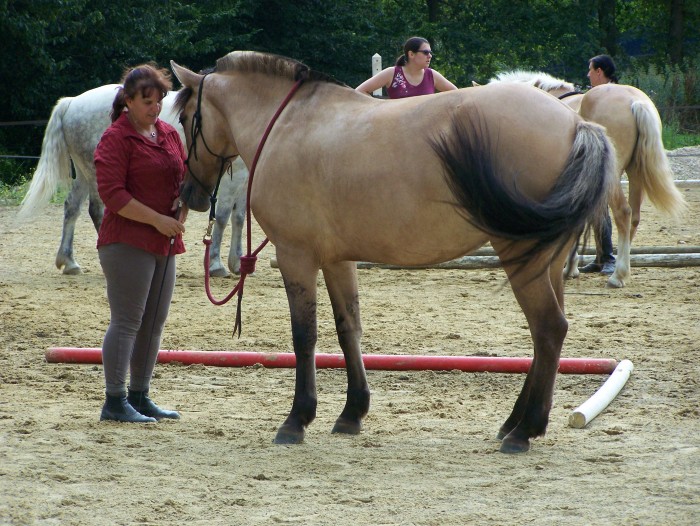 4ème exercice, déplacement des hanches, il faut se mettre presque face au cheval un peu sur le coté, la main levée pour ne pas avoir le cheval qui avance, avec l'autre main qui a le stick, on pointe vers les hanches, on avance vers l'arrière main en faisant un demi-cercle vers les hanches, il faut laisser assez d'espace pour notre demi-cercle pour que le cheval ai assez de place, il faut se matérialiser son cercle d'espace par rapport au cheval de la taille de son avant-main (j'espère être assez clair !!)