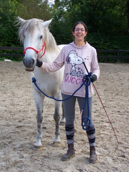 La longe n'est pas facile, car il faut penser à rester à sa place, regarder la place du cheval, et ne pas trop s'embrouiller avec la longe qu'il faut allonger ou raccourcir en cas de besoin.