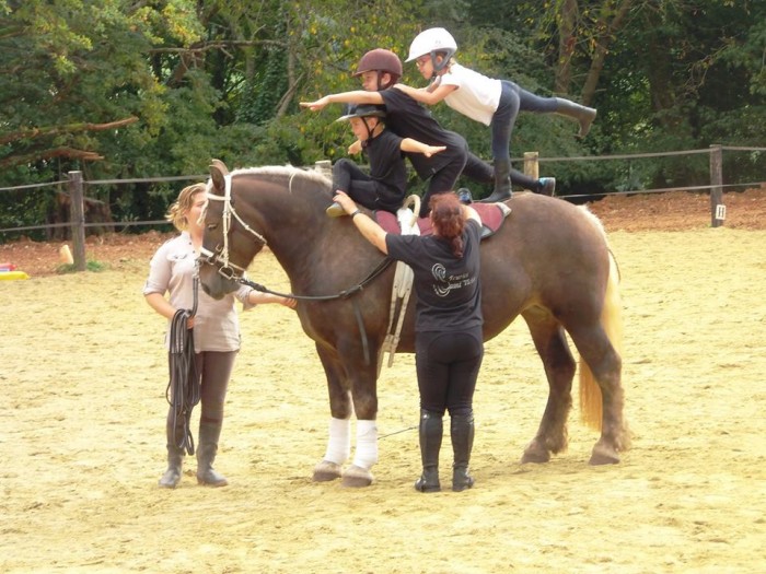 Avec l'aide D'Aimie, notre stagiaire pro, pour longer la belle Aquarelle, et Létichat + mouky dans "les coulisses"pour préparer les enfants avant leur passage sur le dos d' Aquarelle, nous avons présentés quelques figures, en individuel, à 2, à 3, puis, à 4!