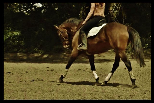 Une détente sur le dressage parfaite ! Une jument à l'écoute et qui se porte en avant. Mais une fois rentrée sur le carré, une horreur ! Elle précipite, se braque, bref un cauchemar...Tant pis !