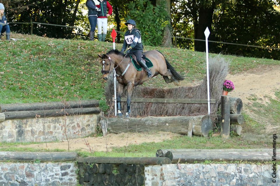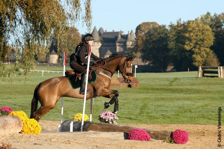 On va chercher le 6 qui est un trou. Là, c'est délicat parce derrière, il faut tourner un peu raide puis relancer pour aborder le 7 qui est un tronc beige sans difficulté particulière. Donc je ralentis fort et Avatar repasse au trot après le trou, ce qui nous aide pour tourner. Je relance bien, le 7 passe bien, on se dirige sur le 8, une petite palissade juste avant le gué.