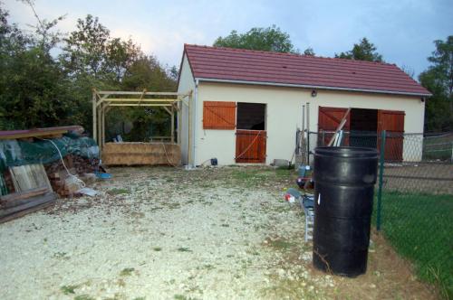 Notre dépendance fait 40m² : à peine la moitié pour stocker foin et paille, l'autre moitié comme abri donnant sur un paddock clôturé d'environ 600m².