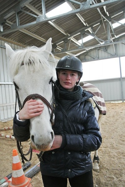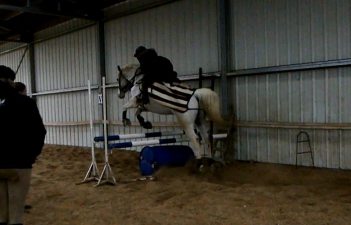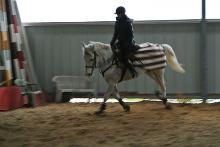 Du coup Amélie m'a installée une ligne de deux verticaux à 50cm avec une foulée entre, et un autre obstacle sur l'autre longueur du manège, croix pour la détente qui a finit en un oxer à 70cm