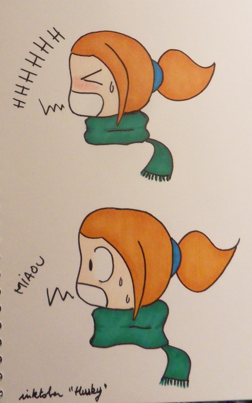 Pour le thème "husky", j'ai choisi la traduction "enroué"/"rauque" en l'illustrant avec l'expression "chat dans la gorge".