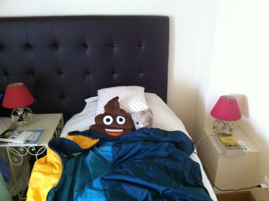 mon lit avec ze ultime cadeau, l'emoticones caca en peluche