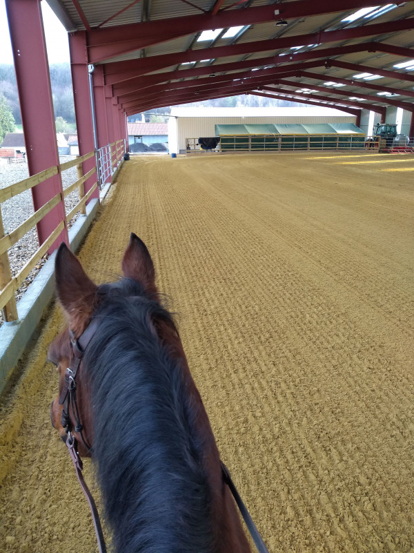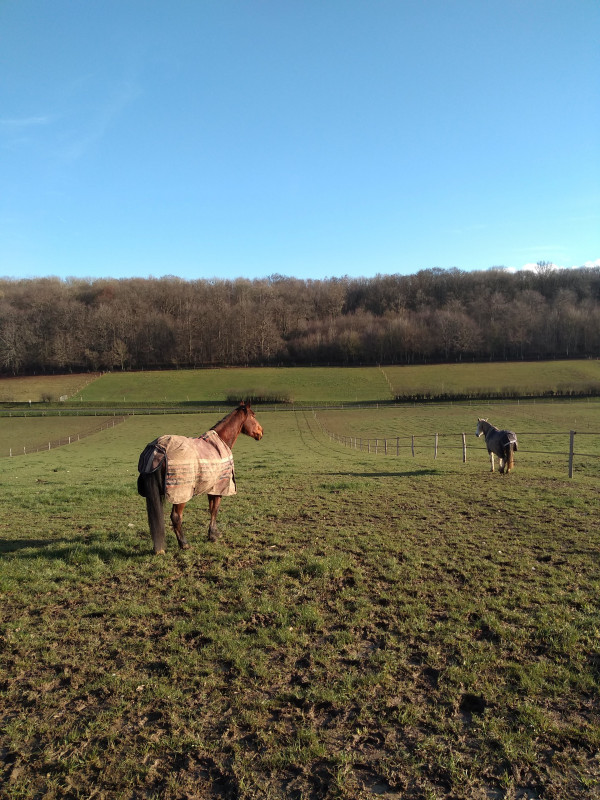 ensuite galop. compliqué le temps qu'elle se racle la gorge. ensuite pas mal. au fur et a mesure tellement pas mal que je tente des trucs. departs du trot et du pas , la jument bien sous elle, je me dis oh allez on va voir ca fait longtemps : galop pas. ca passe. bien. j'en ai fait une tartine du coup. c'etait cool.