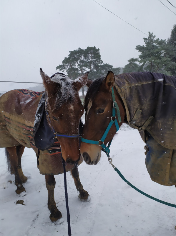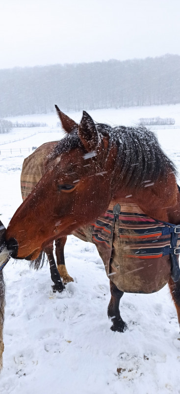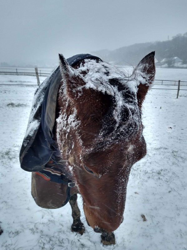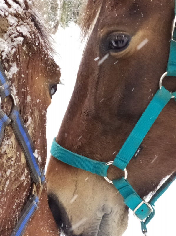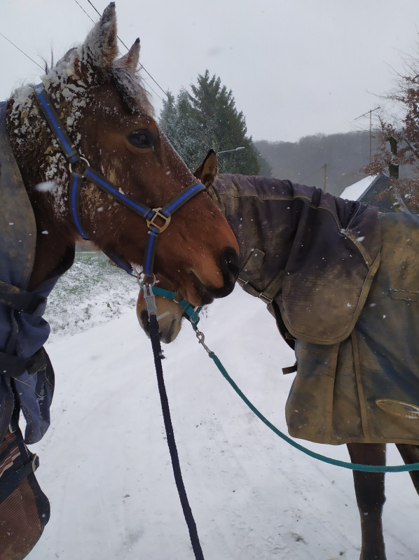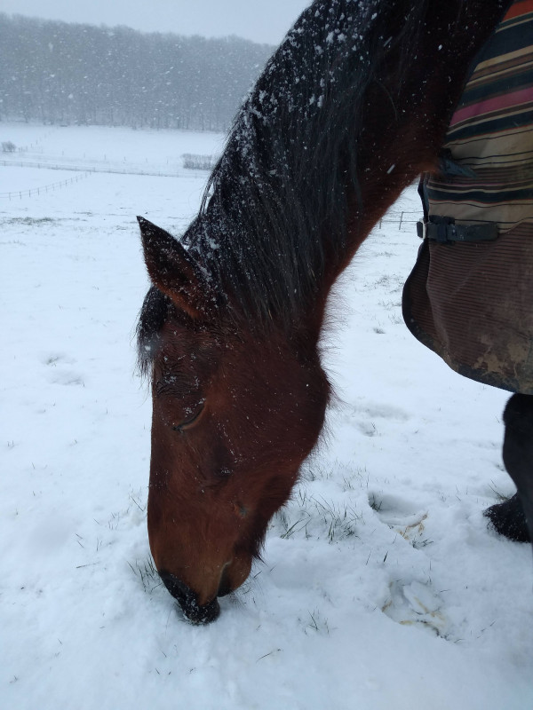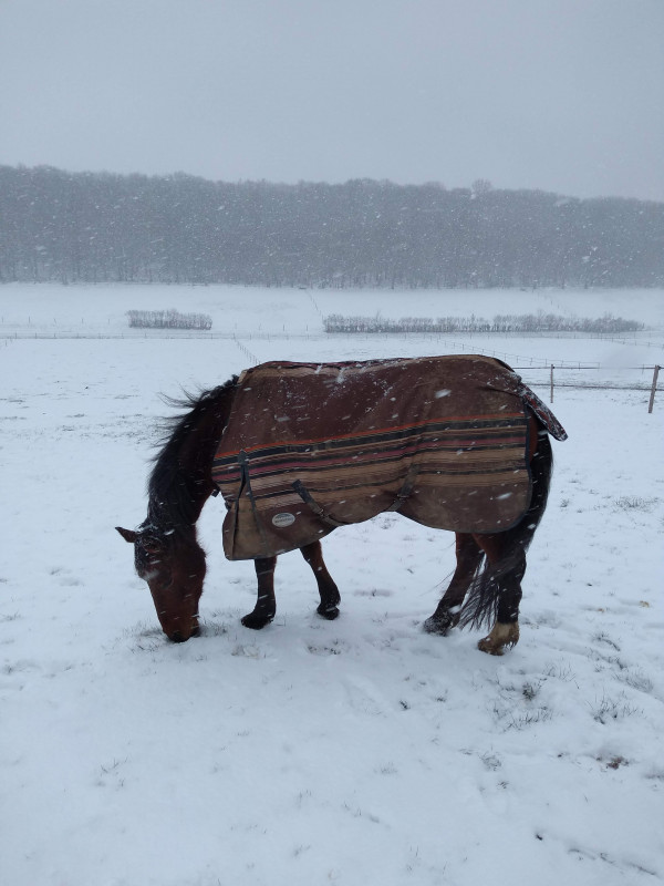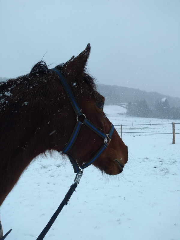 BREF. rdv podologue pour martingale hier matin, en plein blizzard. elle avait froid ma pauvre biquette, toute tremblante malgré la couette. j'ai remis une polaire en plus sous la 250 gr pour qu'elle se rechauffe le temps du parage. parage RAS, pieds supers, une des plus belles evolutions qu'elle ait vu en si peu de temps sur une jument ferrée toute sa vie. moi joie. gamelle et retour dans dans le grand nord.
