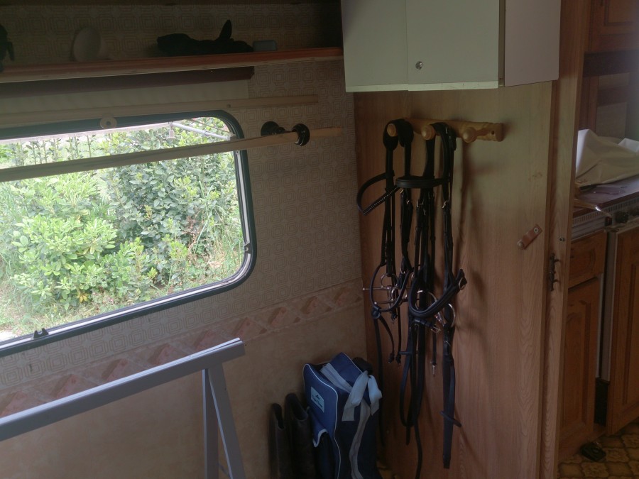 Sur la porte, quatre crochets sans fixation sur lequel j'ai accroché mon sac à chaps, mon sac à bridon renfermant mon licol en cuir, un organisateur de salle de bain qui est suspendue à deux crochets pour ranger la douchette et l'éponge ainsi que les mouchoirs lol.