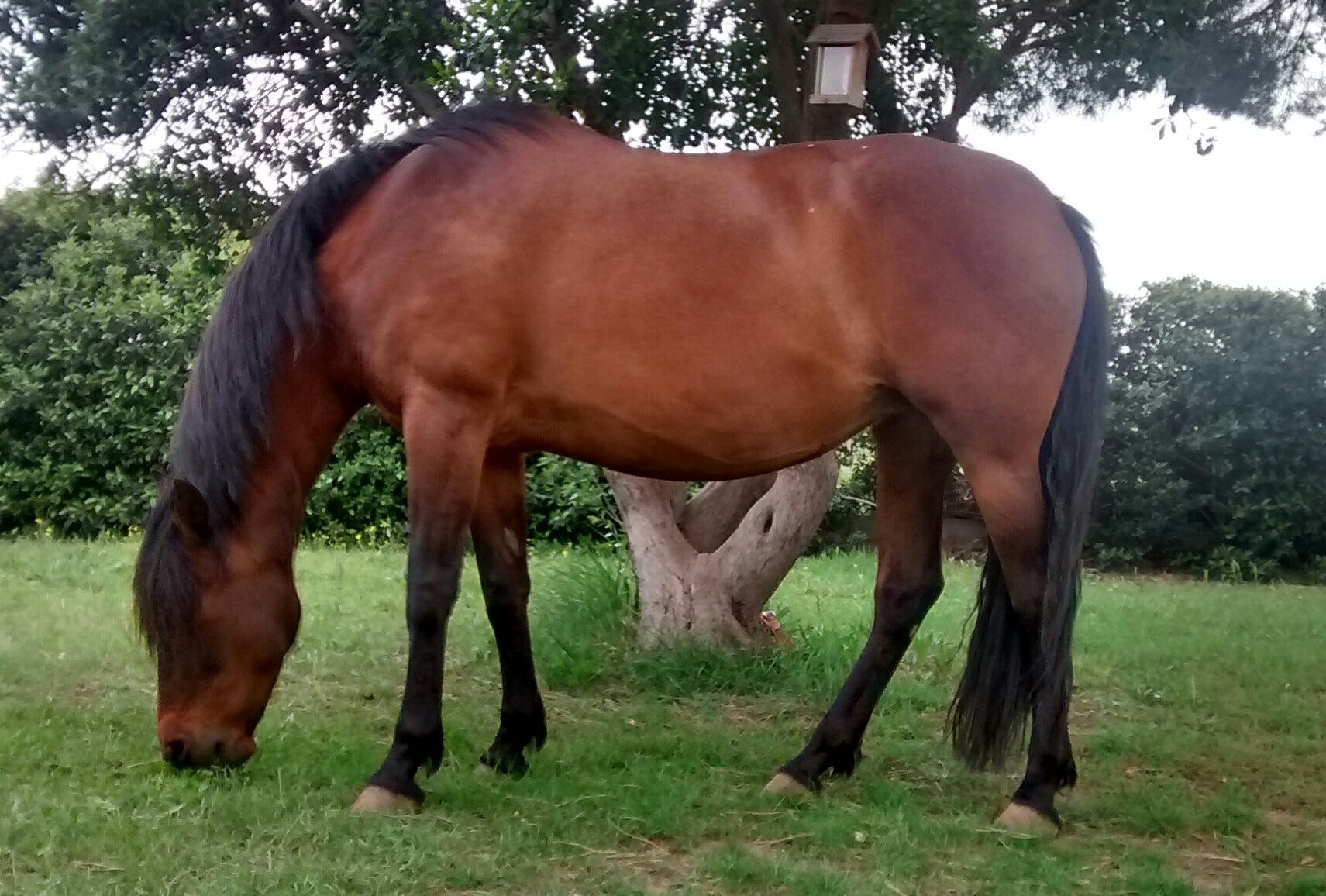 Bonjour ! Je vous présenteprésente Meloja Rombo, PRE PP qui a passé ses dix premières années en Espagne où elle était poulinière. Elle est ensuite venue en France pour re faire des poulains (1 en France et 4 en Espagne). Elle est restée un an et demi sans être travaillee, mais elle était vraiment très calme ! Le jour de l'essai, elle m'a mise par terre (trop plein d'énergie et joie à l'idée d'être enfin montée), mais je ne me suis pas laissée refroidir juste pour ça. Je suis revenue régulièrement pendant une semaine pour la connaitre un peu mieux, et il s'est trouvé que le courant passait très bien entre nous !