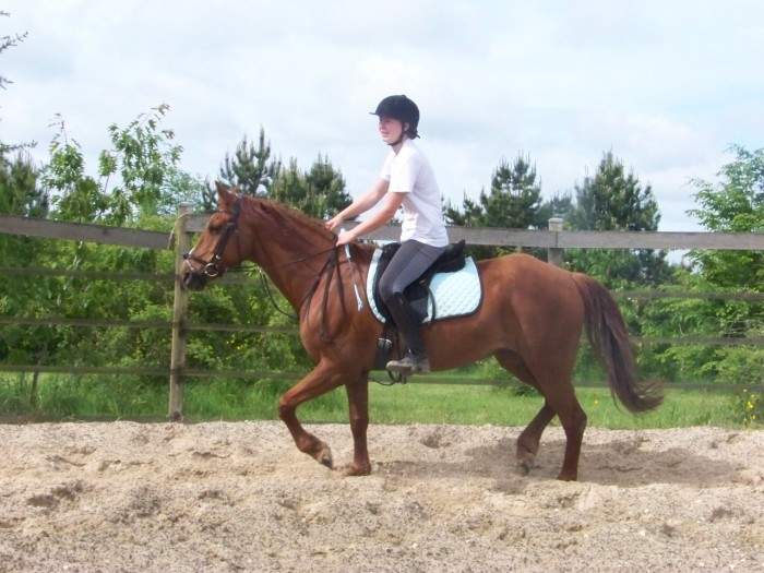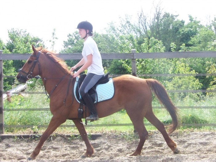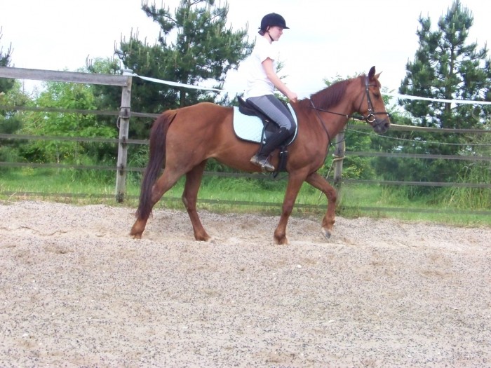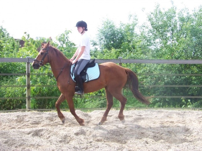 Je selle, je monte, on marche là elle a décidé de m'embêter elle arrête pas de retourner au milieu du coup je lui fais faire des cercles pour pas qu'elle pense qu'elle a gagné. On trotte au début lentement comme toujours et puis elle s'encapuchonnait je me demandais ce qu'il se passait -> le taon était sur sa jambe elle voulait l'enlever --" et puis j'arrive à la faire accelèrer ! Elle a été top !