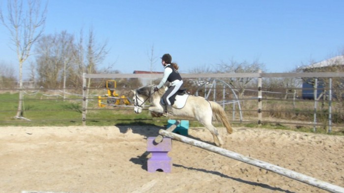 Du coup j'y retourne au petit trot, elle est pas trop mal mais encore un peu chaude elle me saute la dernière barre je décide donc de les passer au pas puis au trot une fois qu'elle a comprit.
