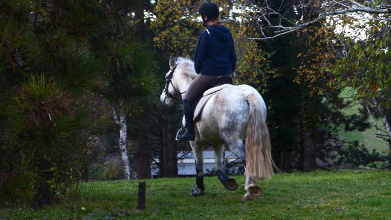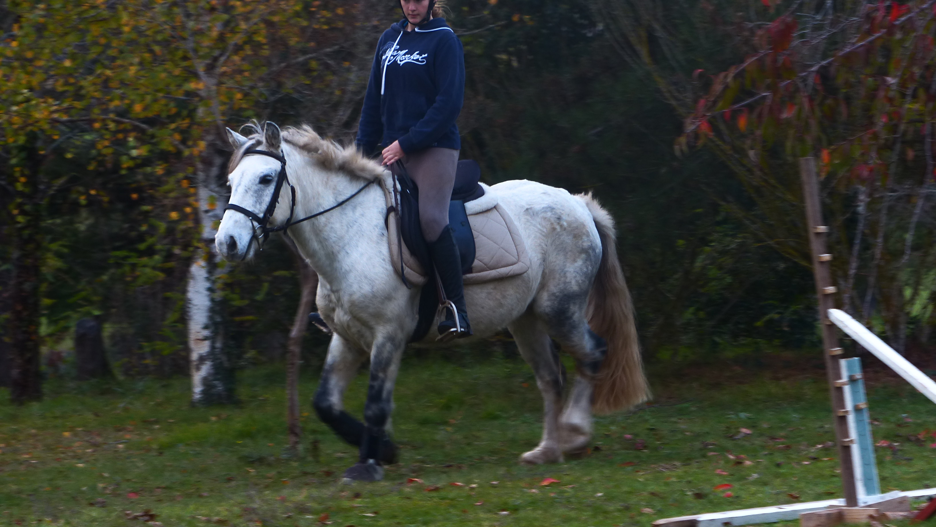 Je la travaille au pas et au trot, elle est super bien ! Je fais quelques arrêts, ils sont moyens mais c'est pas étonnant parce qu'elle en profite pour chercher les chiens !