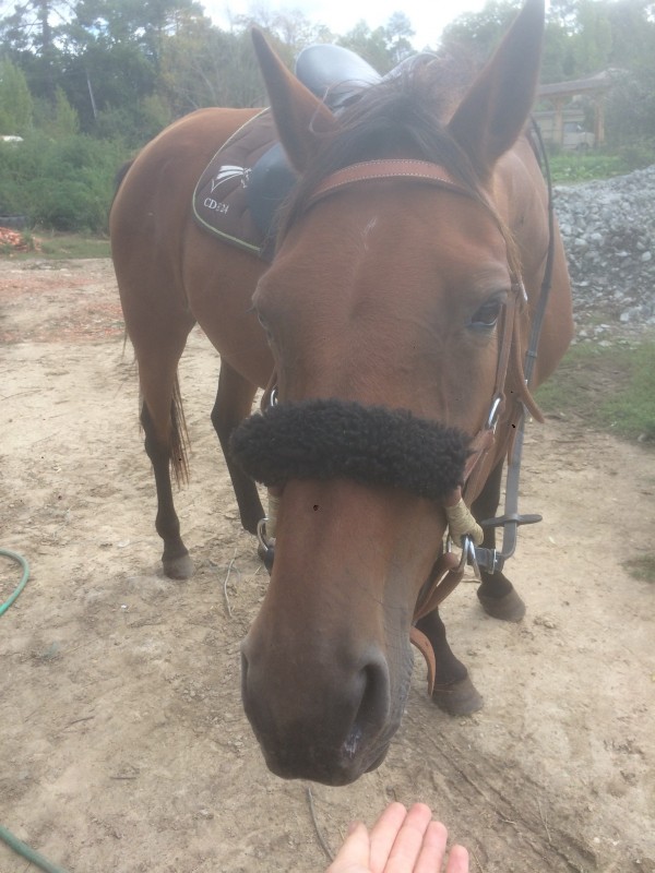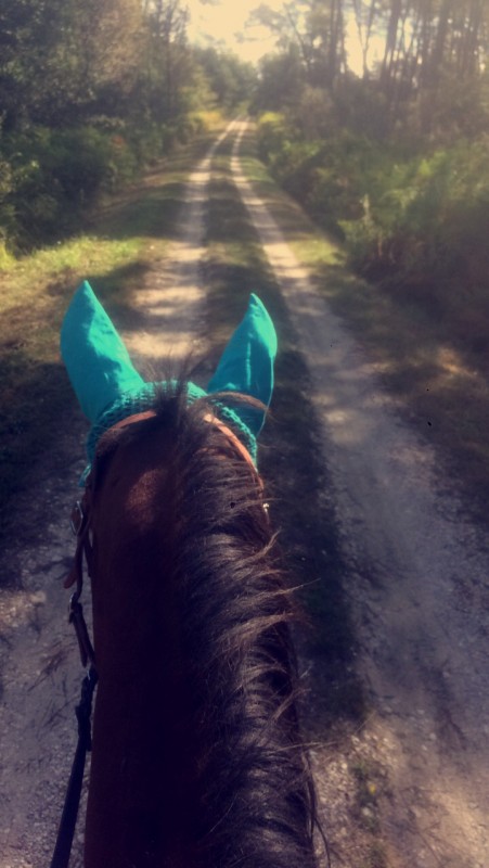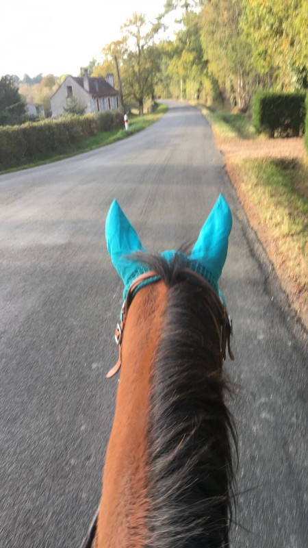 Donc la miss a été (presque) exemplaire. 2 ou 3 tentatives de demi-tour déjouées par moi même en début de balade. Ensuite tout a été nickel ! Que du pas pour bien se re-familiariser avec les lieux et les aides en extérieur. Juste un tout petit peu de trot sur la fin pour tester. Elle garde un petit trot et repasse au pas quand je le lui demande donc très bien. On a refait l'exercice 3 fois sur de courtes distances.