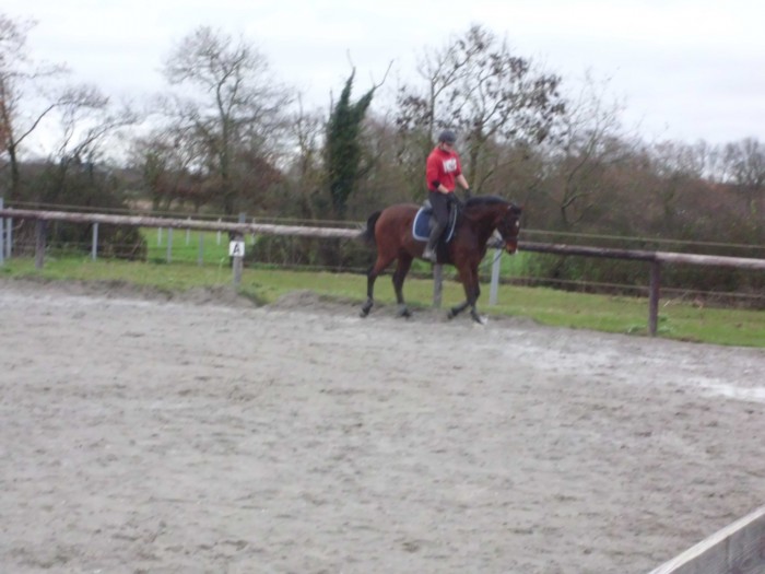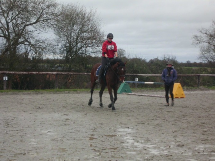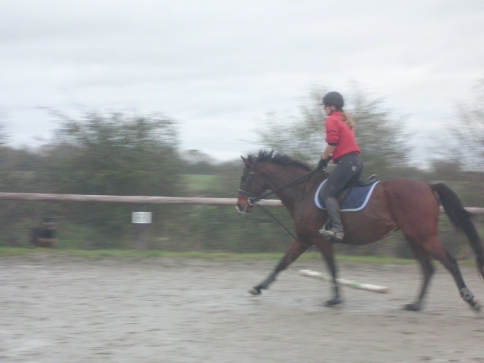 On s'échauffe sur le dôme noir au trot et au demain (j'ai vraiment du mal au trot --') et ensuite, travail sur un petit dispositif : barre au sol - 3 foulées - croix (puis vertical et enfin oxer ^^).