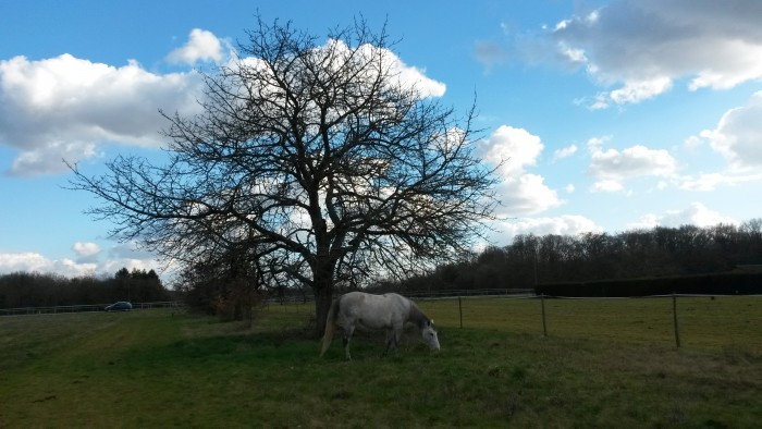 Bonne nouvelle : la proprio était sur place, tout était ok. Elle nous laisse ses papiers (dont la carte de propriété) et tout son matériel (plutôt…pourri), ayant avant essayé sa selle, j’ai préféré acheter la mienne lors du salon quelques semaines auparavant… Allez hop ! Sun dans le van avec beaucoup de mal, puisque très faible. Le trajet se passe bien. Lorsque la pépette arrive a sa résidence, elle se jette sur le peu d’herbe qu’il y avait. Voilà, à son arrivée le 19/12/11 :