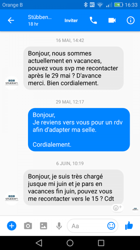 Juste pour vous déconseiller fortement d'avoir affaire à Stubben Hauts de France, 8 jours après avoir encore demandé un rdv, voilà ce que j'ai reçu. A savoir, pour ceux qui n'ont pas suivi l'affaire, que je demande un rdv depuis le 2 mai....et qu'il faut une semaine pour avoir une réponse de le recontacter plus tard.
