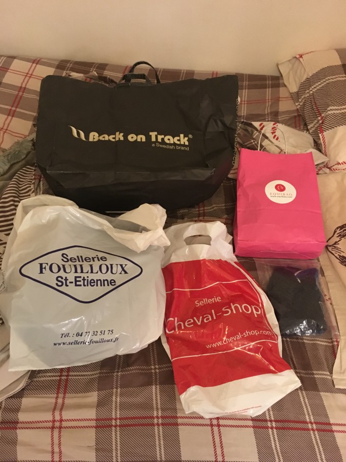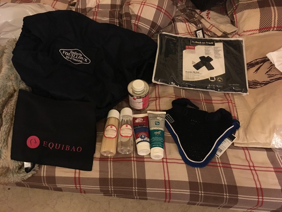 Du coup, rênes Equipe, Easy Shine Ravène, tapis weekend RG, chaussettes, couverture performance 400g qui couvre le bidon avec couvre cou, longe, éperons et lanières, un seau pas sur la photo, et je crois bien que c'est tout !