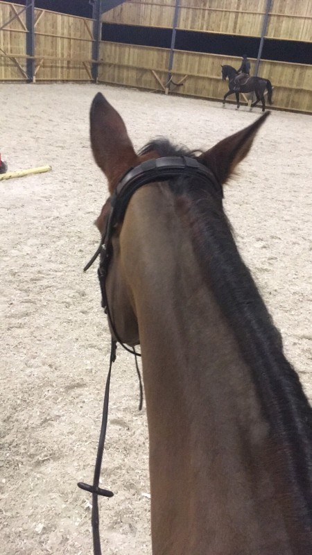 Ce matin j'ai monter avec mon filet de saut et donc le mors combiné de Beris avec les rênes allemande au pas/trot que j'ai vite retiré et Swann était trop, pas de pétage de plomb, très sage malgré l'autre cheval qui était très électrique, même une fois les rênes retiré, elle n'a pas eu peur du fameux coin aux fantômes (du coup quand c'est séances de longe je longe dans ce coin histoire de l'habituer).