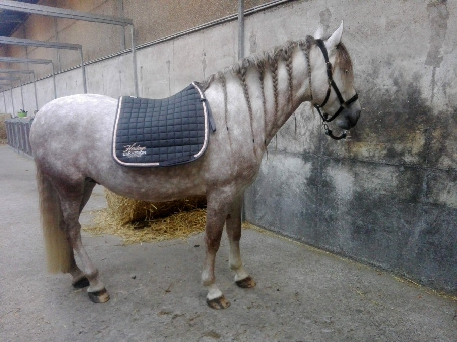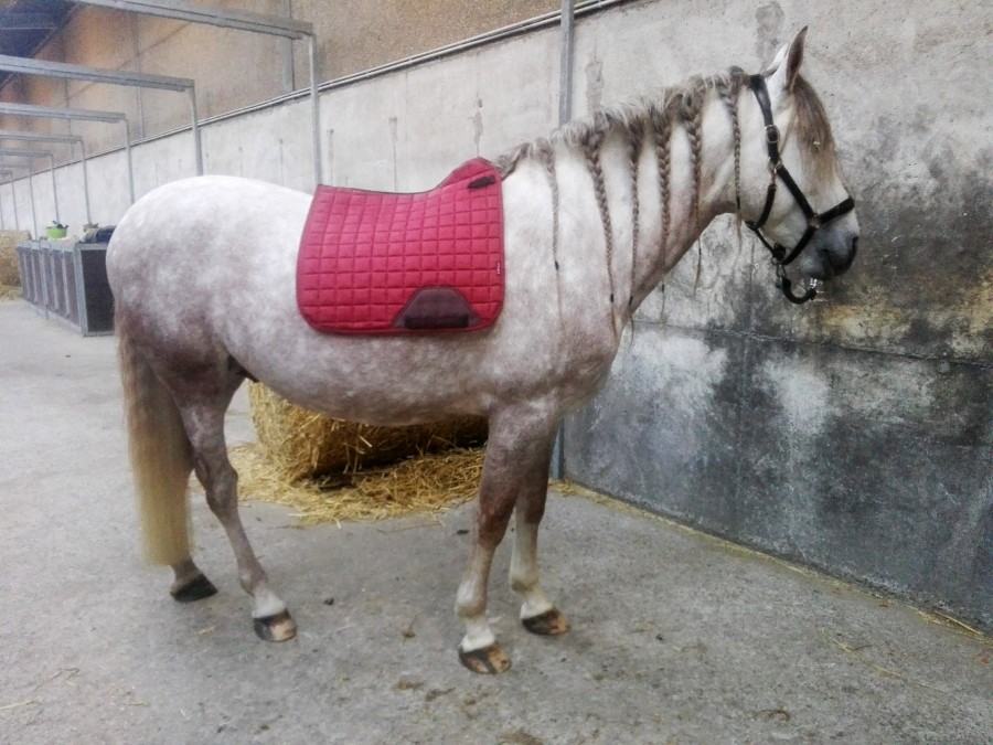 Sinon, en plus positif, je suis absolument fan des bandes Eskadron, la qualité est top, la longueur parfaite (bon pour les antérieurs il y a peut être un tour de trop, mais c'est un détail, pour compenser je prépare mon boulet avec un tour de plus), et j'aime beaucoup la couleur sur poney. (J'ai ressorti un vieuuuux couvre reins pour m'assortir un minimum, même si ce n'est pas le même ton). Bon, et meilleure séance qu'hier, à part que les chiens de la palefrenière ont failli me faire me fracasser le crâne ou fo**tre en l'air mon cheval, ils déboulent à fond en faisant la course à 1m de nous (alors qu'ils nous avaient déjà surpris dix minutes avant quand je le marchais tranquillement au sein des écuries pour détendre avant de bosser, j'ai du m'arrêter pour pas les écraser), mais la deuxième fois ils ont débarqué de je ne sais où, j'ai cru qu'on allait terminer dans le rebord en béton ou le fossé derrière, ça l'a vraiment paniqué. C'est vraiment le seul truc qui m'embête à ces écuries, les chiens qui traversent les carrières à fond sans que les maîtres ne s'en soucient etc. Autant j'ai pas le moindre problème avec le fait de voir un chien dressé couché dans un angle du manège, mais voir une furie débouler dans les jambes de mon cheval alors qu'on bosse ou qu'on est entre deux carrières c'est pas possible. Et encore je vous passe le chapitre sur les maîtres qui jouent à la balle avec leurs chiens dans l'enceinte des écuries.