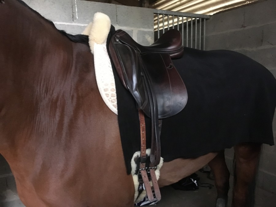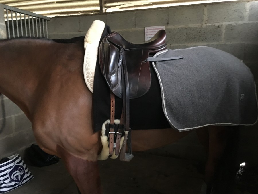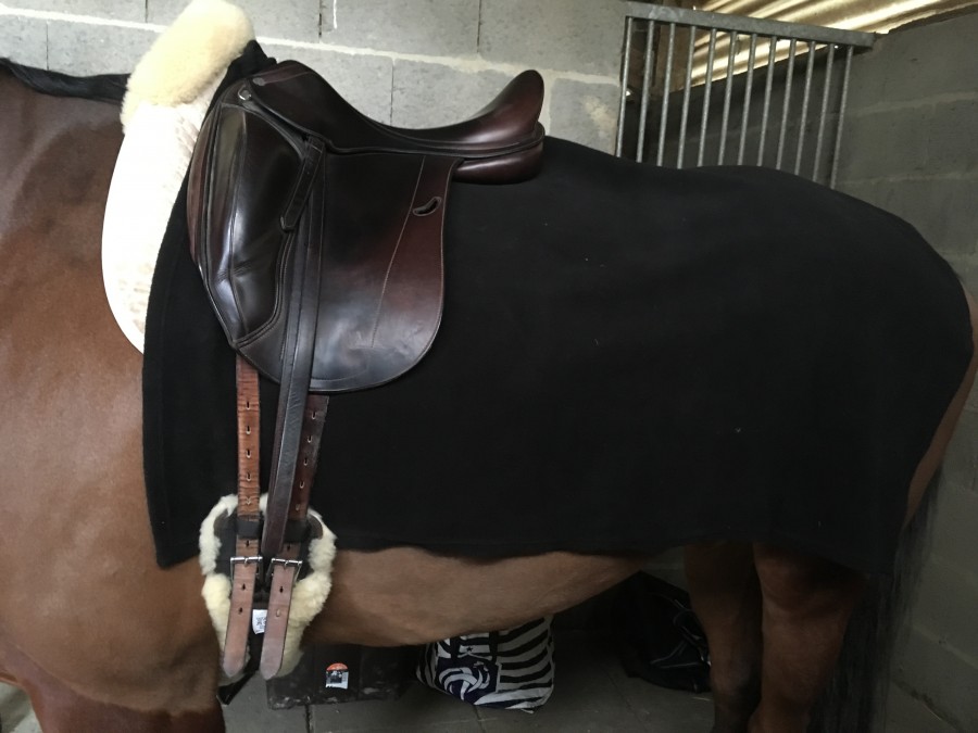 J'ai fait mattes + plaid BoT + CR laine et j'avais ajouté le CR polaire+imper parce que menaces de pluie mais j'avais que le long et bon bof donc je l'ai enlevé et on a pas eu de pluie... bref! Ca a pas bougé c'était pas mal, et chauffe dos sous la couette pendant le pansage et mini stretching express à la carotte en fin de pansage. Elle a été très sage et confortable dans son dos et ses pattes. Par contre bien en chaleur la grosse nympho!