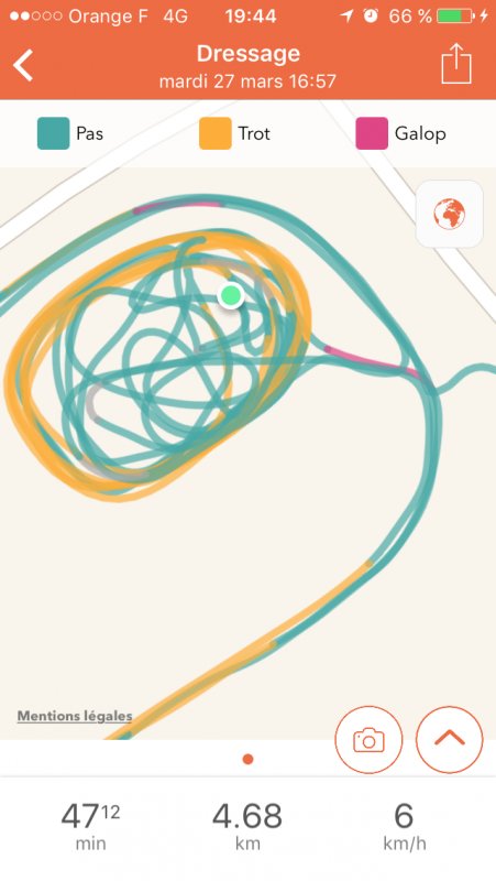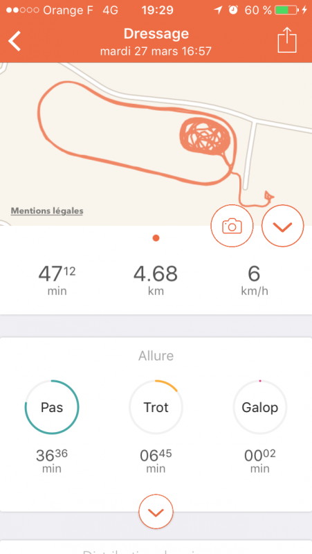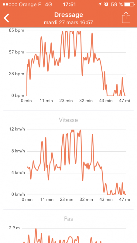 Les 4 courbes entre 23 et 32 c'est mes 4 sessions de trot de 1, 1, 2 et 2 tours de carrière, on voit quand elle trottinait et le petit trot que je l'ai laissée faire quelques secondes sur la piste à la fin. et donc après 43 c'est moi à pied :p