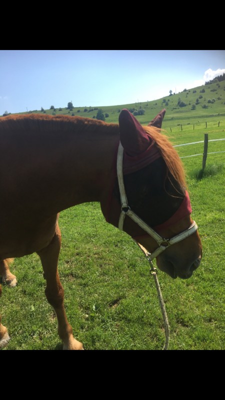 Sinon je viens enfin vous faire un retour dress touch sur mon masque Félix buhler ! Et bien j'en suis ravie ! Plus de blessure , il est " beau " et efficace ! Le cheval rentre la tête volontiers dedans ! Bon il l'a déjà tout salit biensur ! Mais j'adore la couleur !