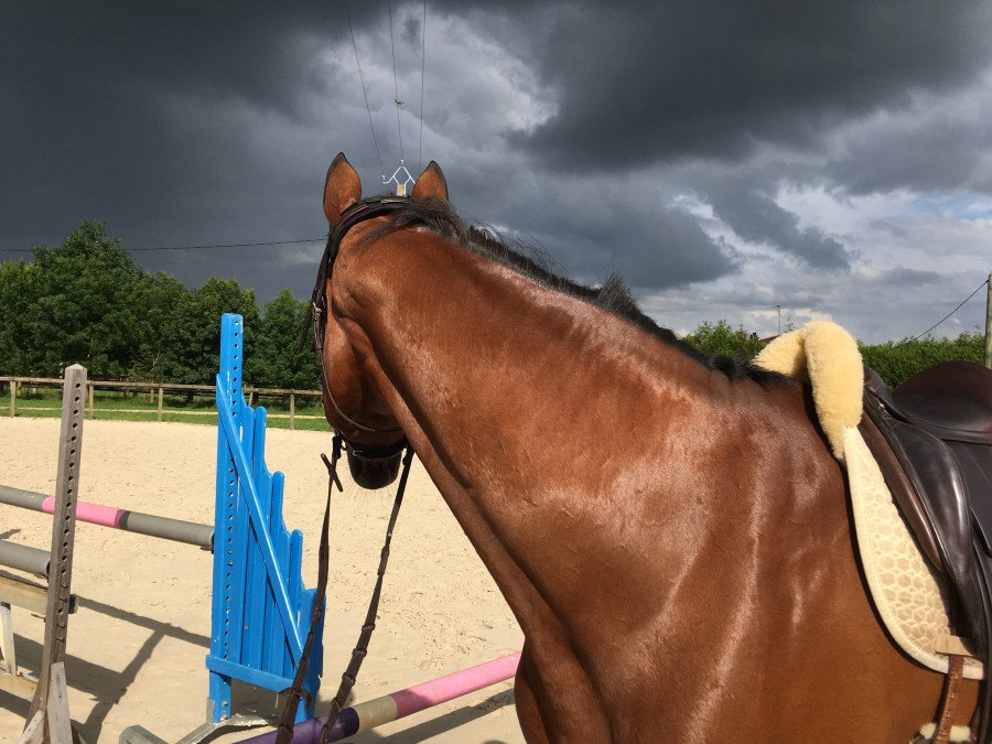 Quincy qui essayait de me dire qu'on allait se prendre l'orage quand je me mettais à cheval ^^ on s'est chamaillées en selle 30s et puis les gouttes sont arrivées ^^ me suis sentie bête en allant nous mettre dans le manège