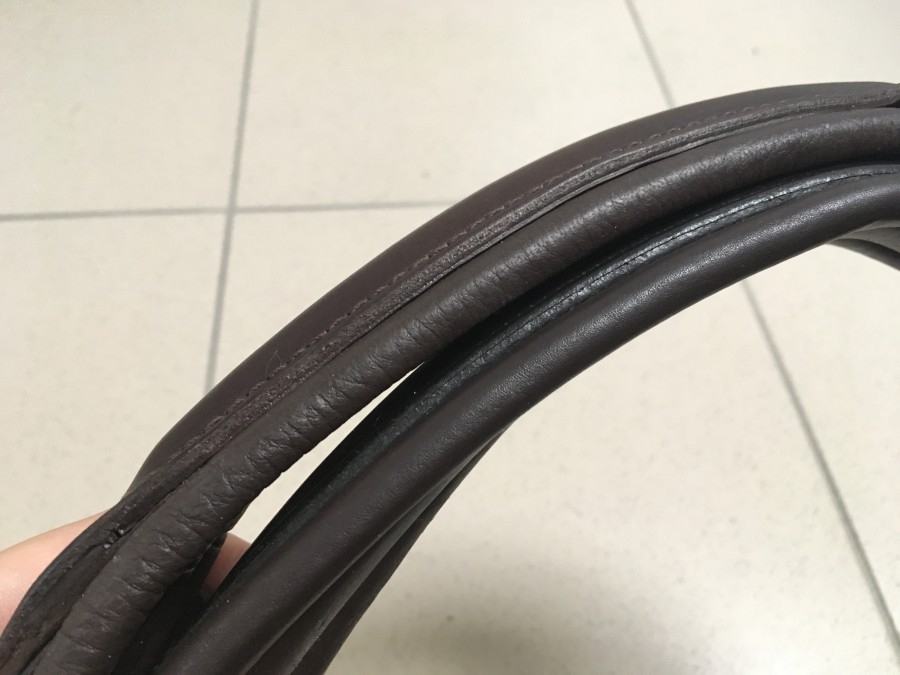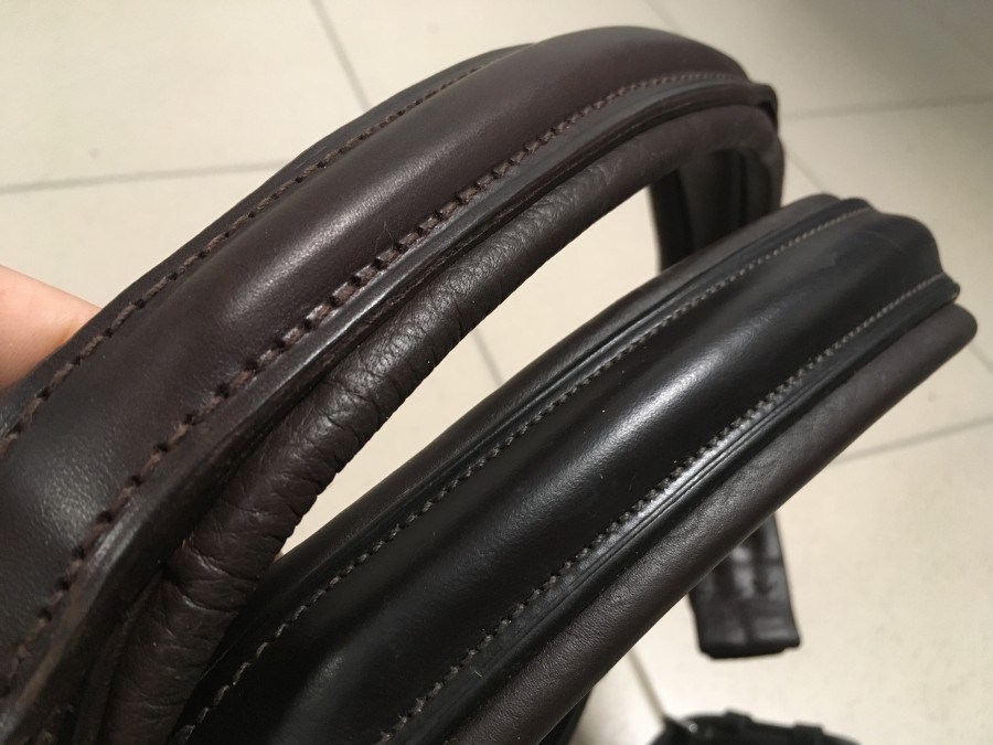 D'ailleurs je voulais vous montrer un truc: la doublure de ma muserolle a l'air plus fine que celle de ma bride (qui vaut moitié moins cher) Et en tout cas elle est toute frippée à côté, j'ai peur que ça soit franchement fragile!