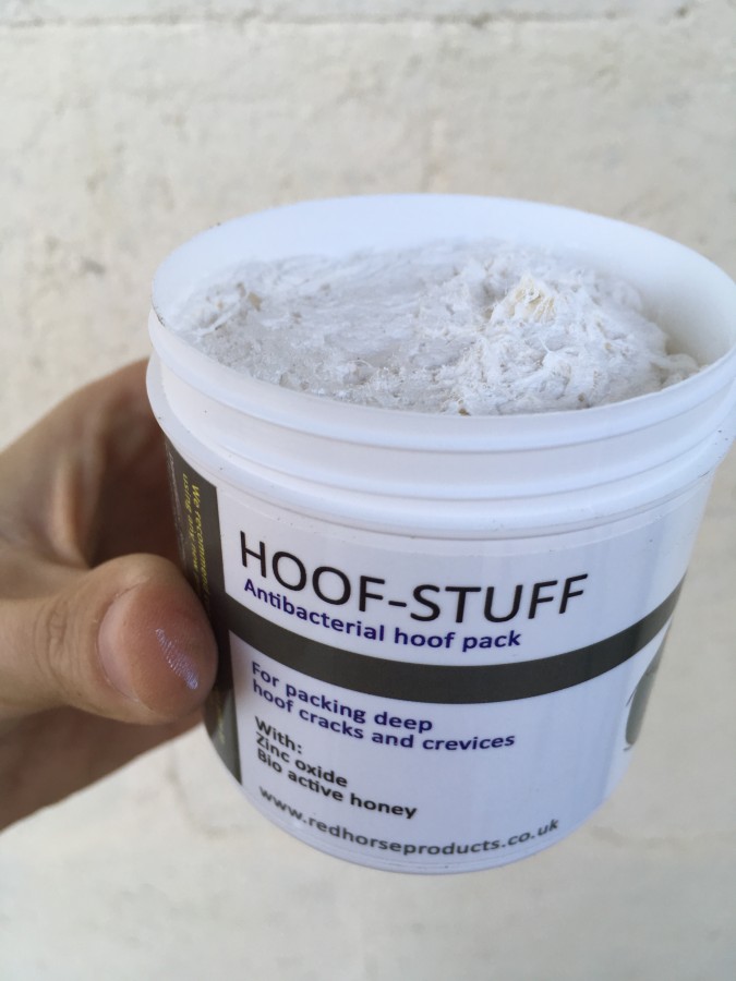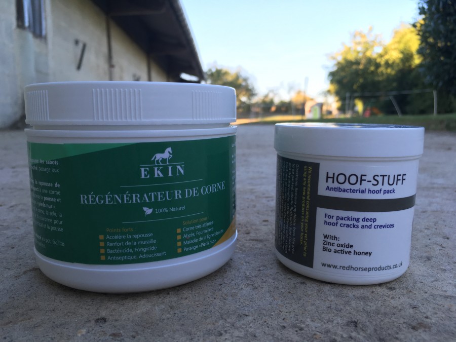 J'ai aussi testé le fameux Hoof Stuff à la mode! Parce que je sais pas comment c'est possible avec la météo mais ça fait plusieurs semaines que les fourchettes antérieures sont très moches crevassées! Pour celles qui connaissent pas l'espèce d'onguent épais est mêlé à des fibres qui permettent de bien colmater les crevasses. C'est réputé hyper efficace... Et j'ai pris le régénérateur de corne Ek1n au passage qui sent fort le laurier donc ça semble être de la bonne came!