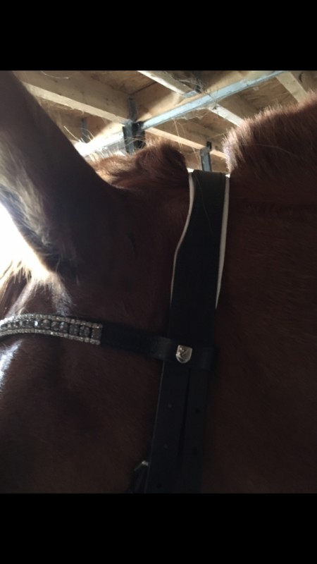 Enfaite il y a pas de têtière , les 2 lanières des montant passe comme ça et sont accrochés ensemble !