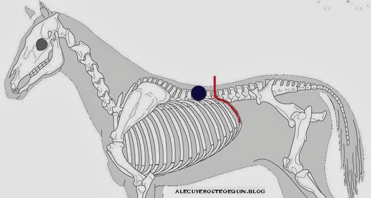 Le point bleu étant le centre de gravité idéal de la selle (à savoir 12/13ième dorsale). Et le trait le suivi de la dernière côte vers son attache à la colonne...