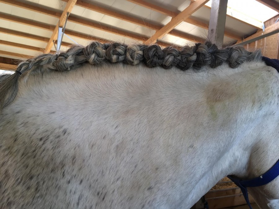 Bah en faite les pions comme ça c'est super simple. Il faut juste faire des tresses et ensuite les remonter avec un sur deux en dessous et ça donne ça. Mon poney est trop infecte à pionter correctement, déjà les petites nattes faut se battre, donc j'ai tricher.