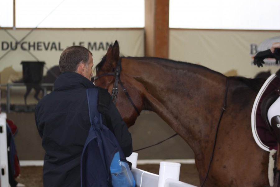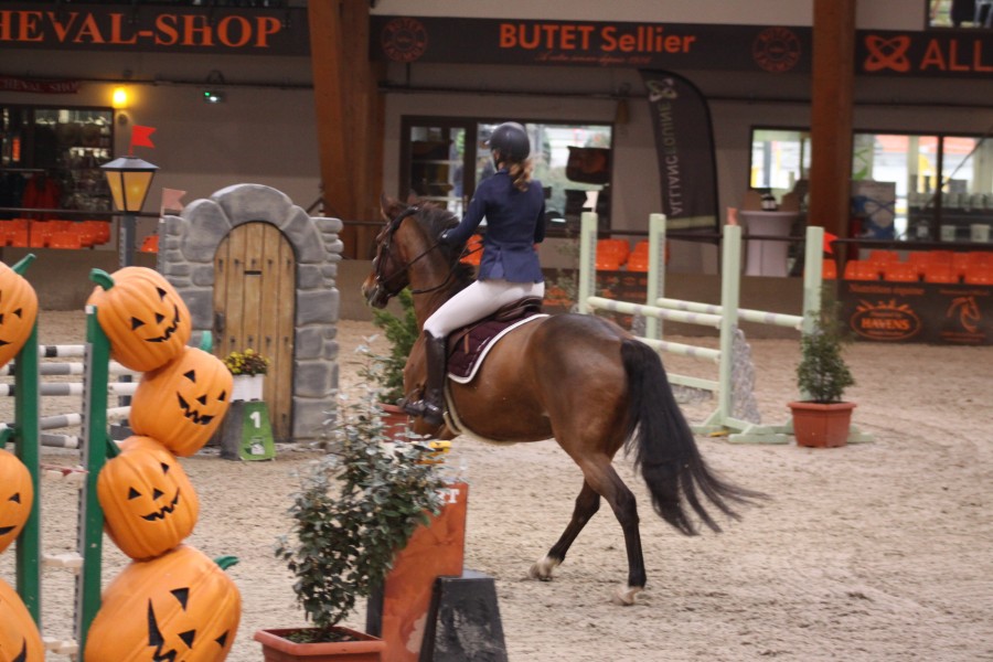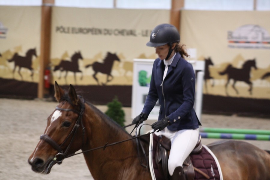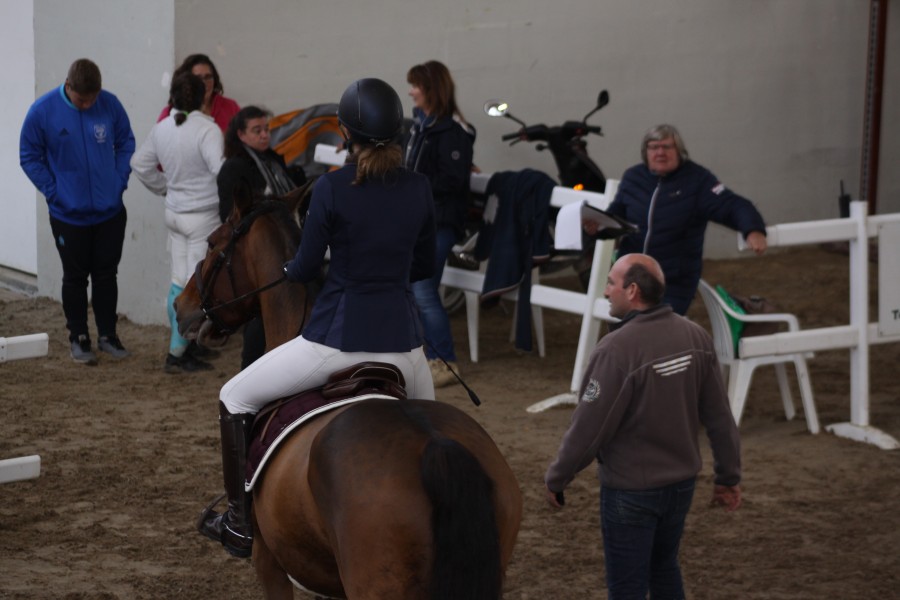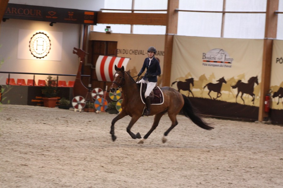 Nous on a fait notre petite prépa dans le Grand Hall, bon ça devait être le truc très cool pour travailler gentiment et en fait, bon fidèle à moi-même j'étais en retard, le stress, et puis surtout cette détente en manège, horrible, la jument stressée, qui fait demi-tour parce que ça bouge dans les gradins ou qu'un cheval arrive sur elle, on saute très mal, enfin moi surtout, et puis sur le tour ça commence mal mais en milieu de tours on se met dedans et on peu enfin bosser et se faire plaisir On est sf dans le temps malgré pas mal de transitions au trot ou même au pas pour travailler